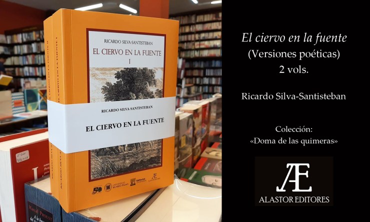 Los dos volúmenes de El ciervo en la fuente (Versiones poéticas), primer y segundo títulos de nuestra colección de traducciones poéticas «Doma de las quimeras», siguiendo el título de un poema de César Moro, constituyen un amplio conjunto de traducciones realizadas por el poeta y traductor Ricardo Silva-Santisteban, de autores como Anacreonte, Catulo, Horacio, Dante, Petrarca, Ariosto, Leopardi, Ungaretti, Quasimodo, Montale, Chaucer, Shakespeare, Villon, Baudelaire, Rimbaud, Poe, Whitman, Wallace Stevens, Goethe, Novalis, Hölderlin, Trakl, etc. divididas en tomo I (488 pp.) y tomo II (524 pp.). Este volumen continúa nuestra edición de las obras completas de Ricardo Silva-Santisteban. Se publica en coedición con la Universidad Ricardo Palma, como parte de la celebración de sus 50 años de vida institucional.