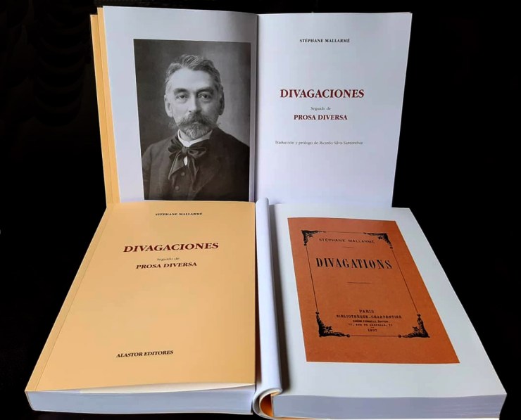 Divagaciones, seguido de Prosa diversa, de Stéphane Mallarmé (1842-1898) reúne poemas en prosa, ensayos, artículos, retratos biográficos de contemporáneos como Charles Baudelaire, Édouard Manet, Edgar A. Poe, Arthur Rimbaud, Paul Verlaine, Richard Wagner, etc., testimonios biográficos y otros inclasificables textos en prosa del maestro del simbolismo francés. La traducción y el prólogo han sido realizados por Ricardo Silva-Santisteban, uno de los mayores especialistas en la obra del autor de La siesta de un fauno. Este libro, publicado gracias a los estímulos económicos del Ministerio de Cultura del Perú, es el título N°28 de la colección de clásicos universales La Fuente Escondida.