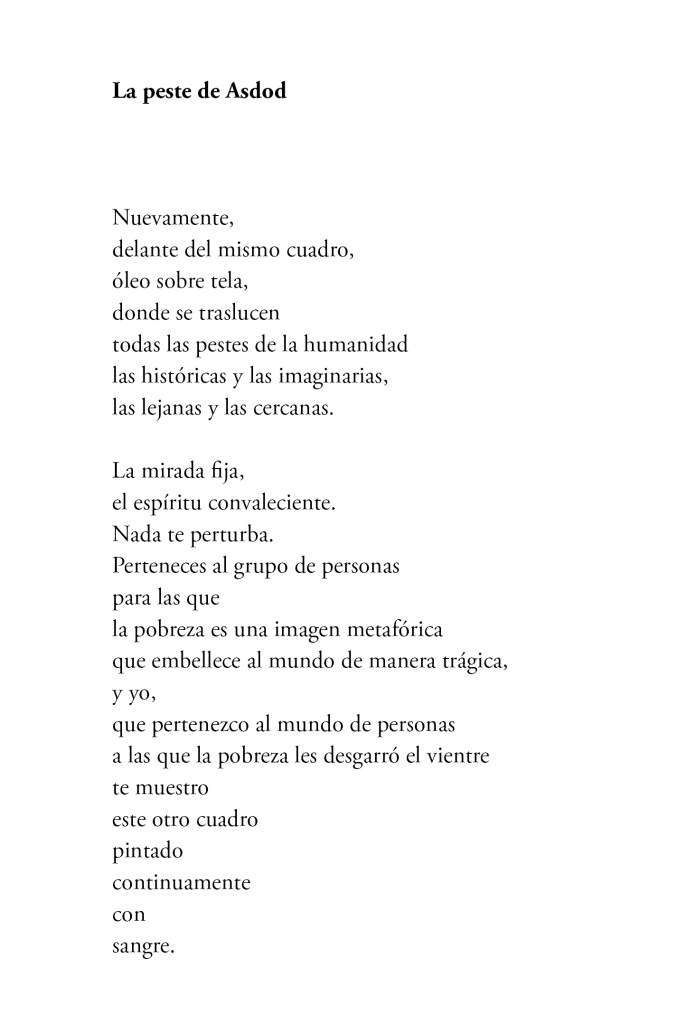 Pues solo la esperanza puede reencantar lo real y esta tarea la toma Luz con su voz poética. Debo admitir que me es inevitable pensar en Luz como el personaje de la Esperanza en el mito de la caja de Pandora, que sale pequeñita y bailando, saltando paso a paso, de la caja de donde han salido todos los males que ya han acontecido. Pues bien, el participio de lo real, “lo devastado ya sido”, se vuelve a actualizar en cada momento y se constituye como amenaza constante al alma humana. Y es por ello que “La Peste de Asdod” tiene tanta potencia, pues nos coloca en la mirada de quien aprecia el óleo sobre tela sin reconocer la violencia de todo trazo y petrificándola en un goce estético como quien hace pan de masa madre mientras los sueños del mundo quedan huérfanos. Esta mirada es confrontada con otra manera de ver, aquella que empieza en los bordes de la primera y que reconoce, en la distancia de la representación, la ambigüedad del alma humana, que no puede situarse ni totalmente en lo real dado ni en lo posible (nuevamente, que se encuentra en medio de la total vulnerabilidad de la inocencia y en la sabiduría muda de quien ya conoce el dolor). ¿En ello consiste su ventaja? ¿Será el alma el nexo que desde lo real se abre a lo posible y desde lo posible transforma lo real?