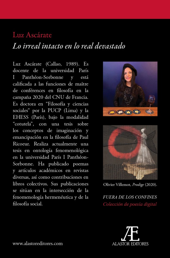 Lo irreal intacto en lo real devastado, primera publicación poética de Luz Ascárate (Callao, 1989), es el primer título de nuestra colección de poesía en edición digital «Fuera de los confines».