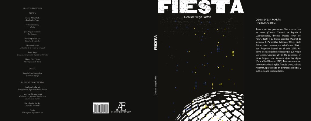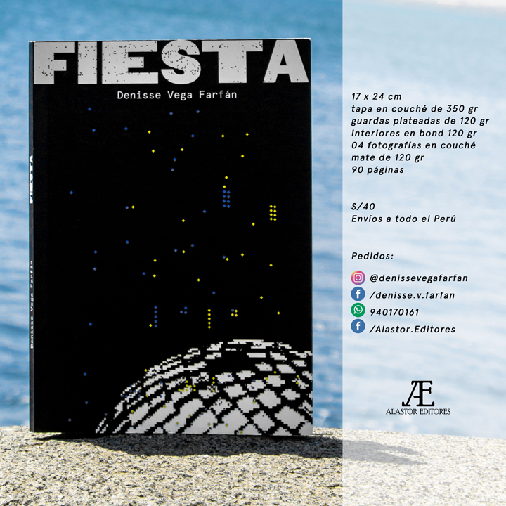 Fiesta es el tercer poemario de la destacada poeta Denisse Vega Farfán (Trujillo, 1986) y segundo título de nuestra colección poética Musica Ficta.Fiesta es una exploración personal de todo cuanto hay de celebratorio en la vida de la autora, incluido su lugar de residencia, la ciudad portuaria de Chimbote, cuyo paisaje urbano, natural y mitológico es el telón de fondo de estos poemas. En este canto vital, ningún ser es menospreciado, desde el humilde alacrán hasta la omnipresente isla Blanca, ni se escamotean los aspectos más lúgubres o violentos de la existencia. Desde lo más alto hasta lo más bajo, son parte de esta Fiesta que, siguiendo el lema mahleriano de que una sinfonía debe abarcar el mundo, intenta comprehender e integrar en un gran fresco musical, todos los órdenes de la existencia. Características: 17 x 24 cms., tapa en couché de 350 grs., guardas plateadas de 120 grs., 04 fotografías en couché mate de 120 grs., 90 páginas. / Fotografías de interiores por Manėc y Rhazú Vásquez. / Diseño de portada: Taller editorial La Balanza. Este libro ha sido publicado gracias a las líneas de apoyo del Ministerio de Cultura.Denisse Vega Farfán (Trujillo, Perú, 1986) Autora de los poemarios Una morada tras los reinos (Centro Cultural de España & Lustraeditores, “Premio Poesía Joven del Perú”, 2008) y El primer asombro (Animal de Invierno & Paracaídas Editores, 2014), título que fue editado en México por Proyecto Literal en 2019. Así como de la plaquette Hippocampus (La Propia Cartonera, Uruguay, 2010). Ha publicado en otras lenguas Une demeure après les règnes (Paracaídas Editores, 2013). Poemas suyos han sido traducidos al inglés, francés, chino, italiano y alemán, apareciendo en diversas antologías y publicaciones especializadas.