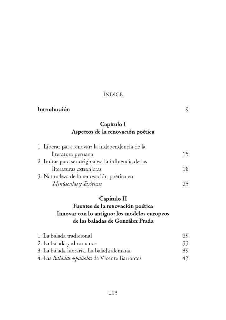 Quinto título de nuestra colección de ensayo ‘Gradus Ad Parnassum’. En el ensayo Las Baladas peruanas de Manuel González Prada como proyecto de renovación poética (2021) Julio Isla Jiménez se propone como objetivo fundamental mostrar que la concepción y composición de las Baladas peruanas son parte de un proyecto de renovación poética que encarna valores literarios nuevos para las letras peruanas del siglo XIX, y que, mediante la asimilación de una forma poética con una larga historia en la literatura europea, pretende integrar la literatura peruana a la universal.