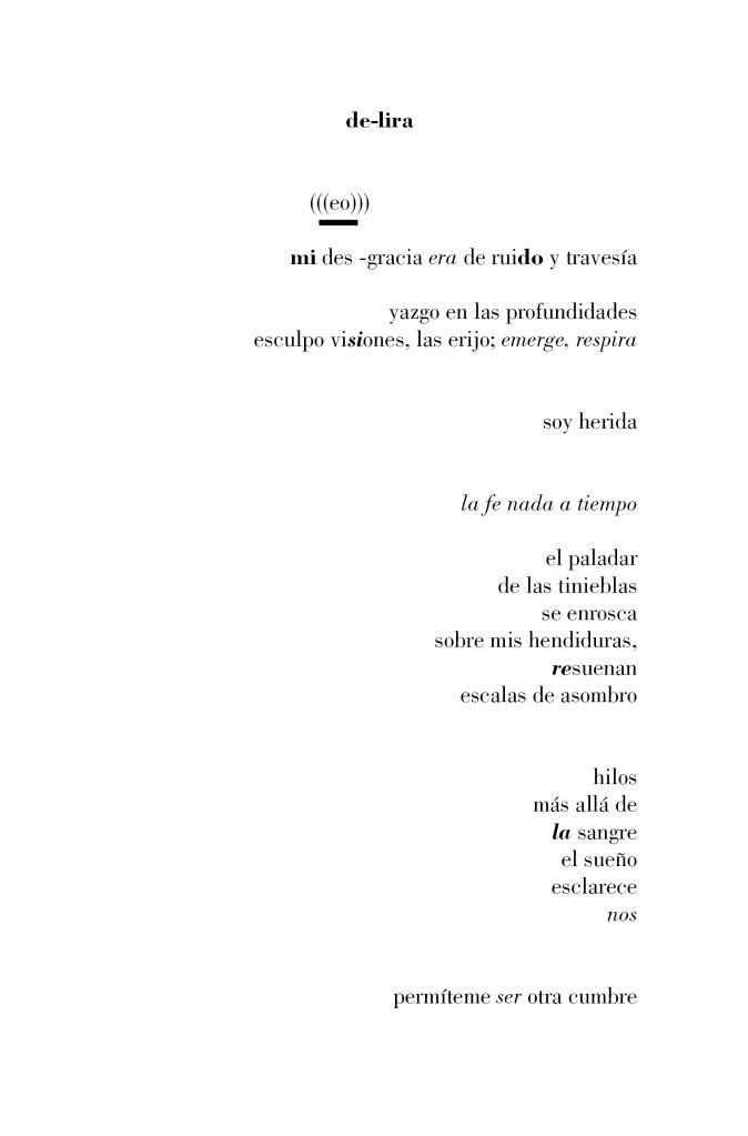 ]de-lira[ hebra disonante, de Paola Dávalos, es el quinto título de nuestra colección Esplendor en la hierba de primeros libros de poesía. En ]de-lira[ hebra disonante un lenguaje poético de ritmo y musicalidad muy marcados dan pie a una intensa expresión onírica, en la que se dan cita el dolor, la muerte y el sueño. El clima de monstruosidad que emerge de algunas páginas convive en tensión con una sensación de esperanza y de plenitud sensorial. Una sutil arquitectura musical estructura los segmentos del libro, configurando una suerte de ópera poética cuya ejecución queda en manos de los lectores.
