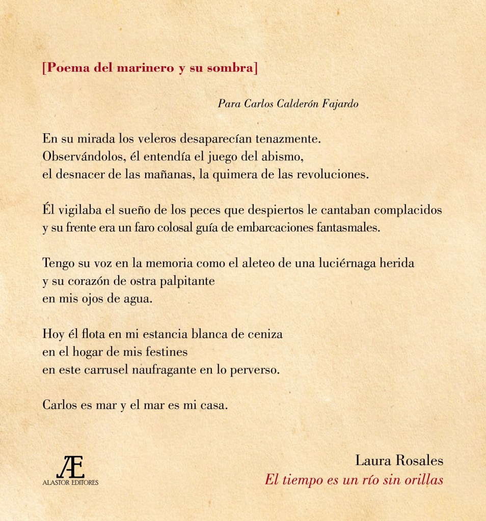 Jordi Doce: «El tiempo es un río sin orillas es un libro fundacional en el que Laura Rosales traza el perímetro de su palabra, sus afectos, sus deseos, el bosque proliferante de la imaginación. Una poesía que hereda aquel «pulso herido que sonda las cosas del otro lado» (García Lorca) y se propone estar en ellas, encarnarlas, habitarlas por dentro; una poesía que resuelve el álgebra de las imágenes y el ritmo verbal con el redoble de conciencia –el relámpago– del verso sentencioso o aforístico; una poesía que conversa con un tú que parece alejarse a cada paso, como un espejismo creado por la propia escritura, y que sin embargo existe cada vez con más fuerza, pues nos permite decir y conocernos. «Soy un animal puro y solitario […] nací con ojos grandes para escribir de lo invisible», dice la poeta, y los veintiún poemas de este libro singular no hacen sino confirmarlo. Aquí hay búsqueda y constatación, temor y temblor, afán de vida y tentación de repliegue, pues «el papel guarda el viento y la alegría». Este libro es un río y nosotros, los lectores, somos desde ahora sus orillas.»
