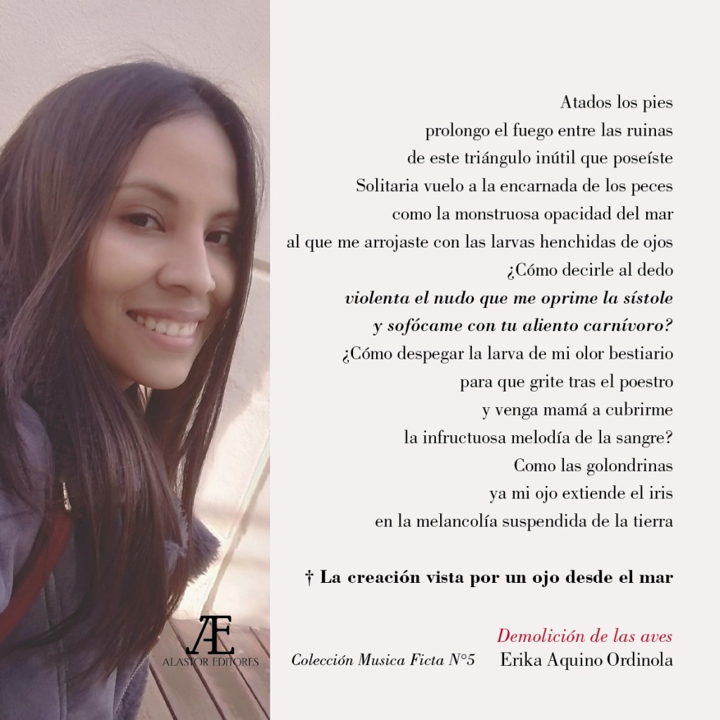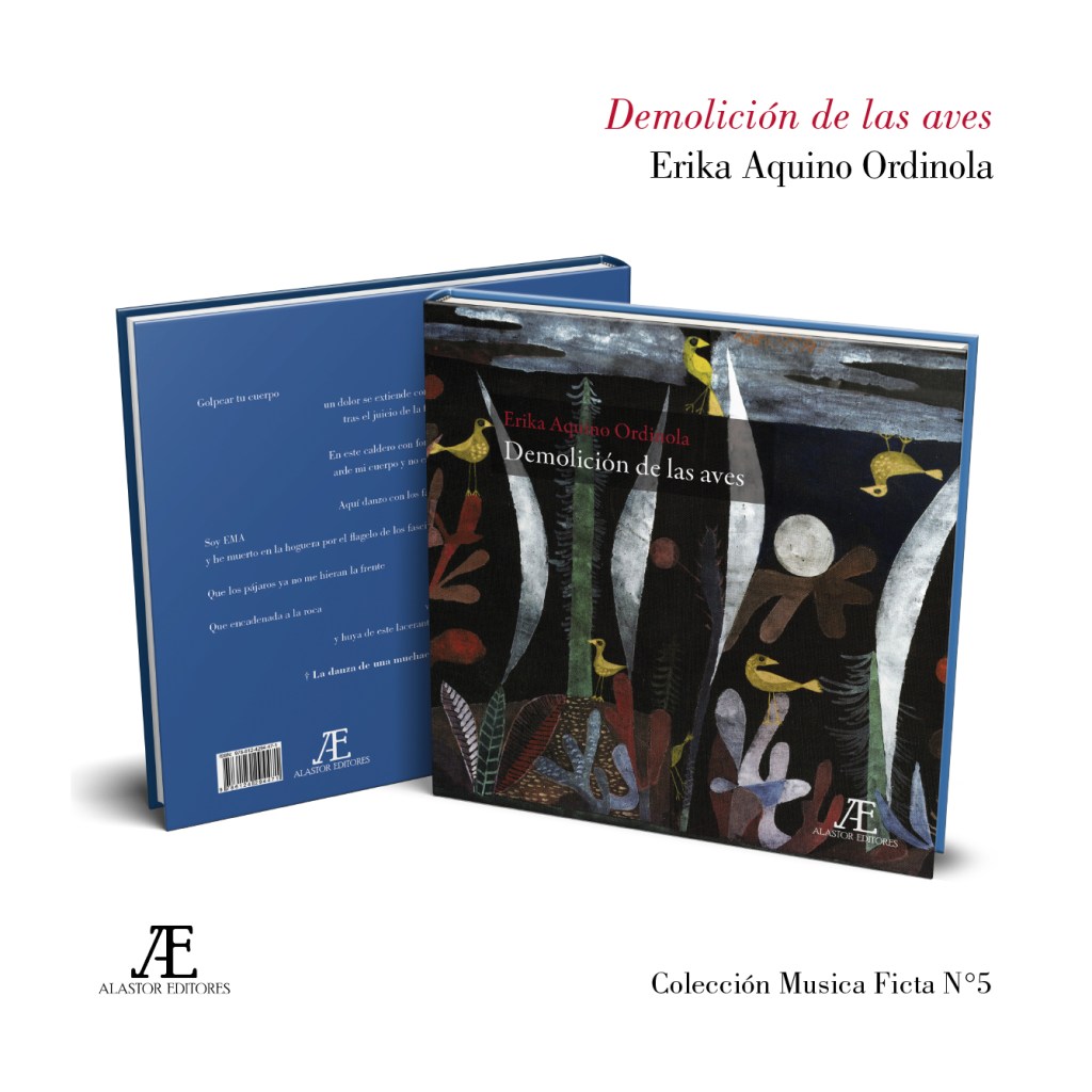 Demolición de las aves (2023) es el segundo libro de poemas de la poeta Erika Aquino (Piura, 1988) y quinto título de nuestra colección Musica Ficta. Desde su título, Demolición de las aves asume que la materia sobre la que se poetiza es objeto de una violencia que oprime, subvierte y demuele el ser de criaturas hechas para volar. Dicha violencia es ejercida de manera material, como en el caso del feminicidio aludido en «La danza de una muchacha llamada EMA», como también simbólica, cuando se priva de voz y de la oportunidad de contar la historia desde su propia perspectiva, a figuras mito poéticas como Ofelia, Ismene, Andrómaca, Yocasta o la propia Medusa, en el poema “Manifiesto melancólico de la guardiana del templo”. Para combatir esta violencia omnipresente, la poeta les da voz y las moviliza en un intento, tan intenso como desesperado, de que no sean borradas de la historia.