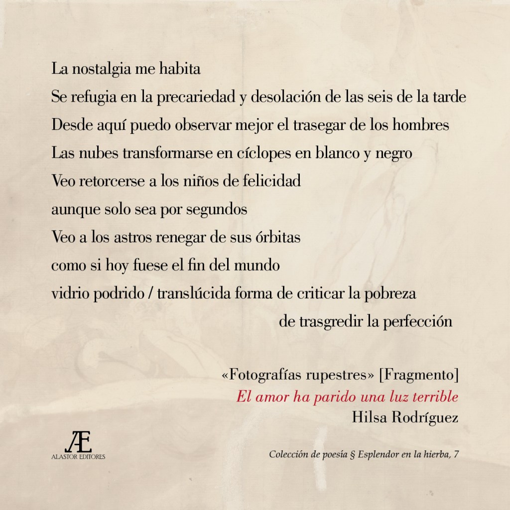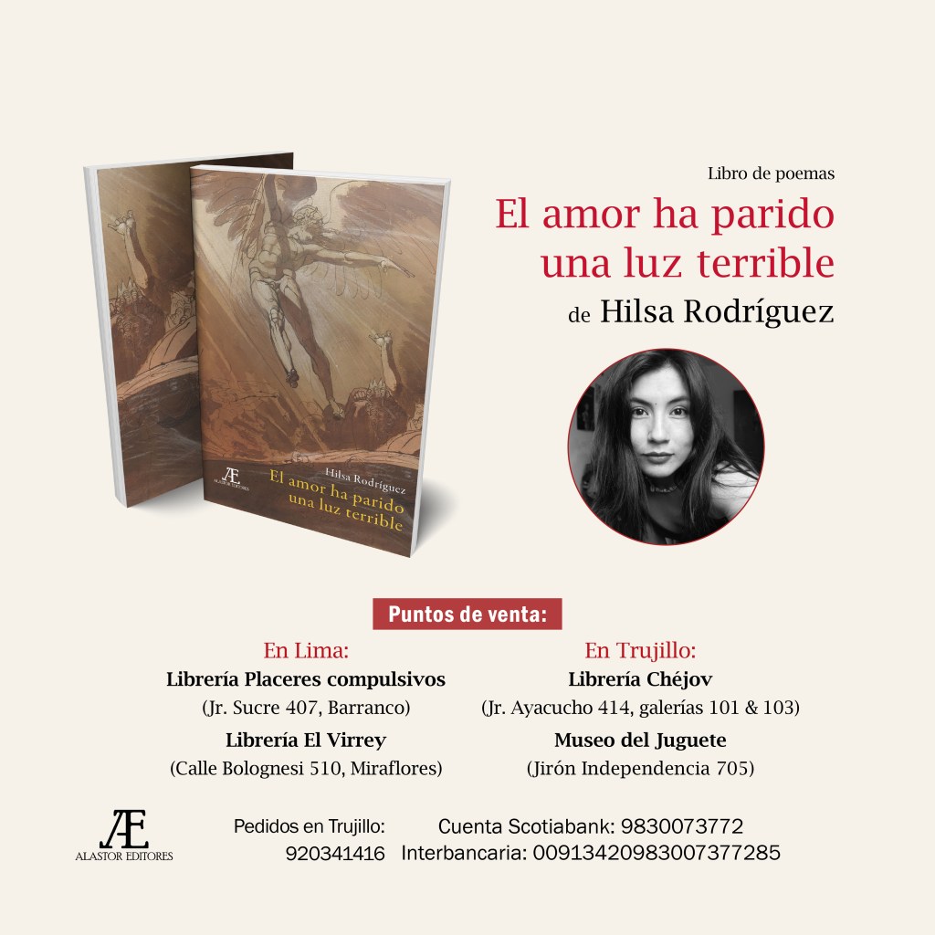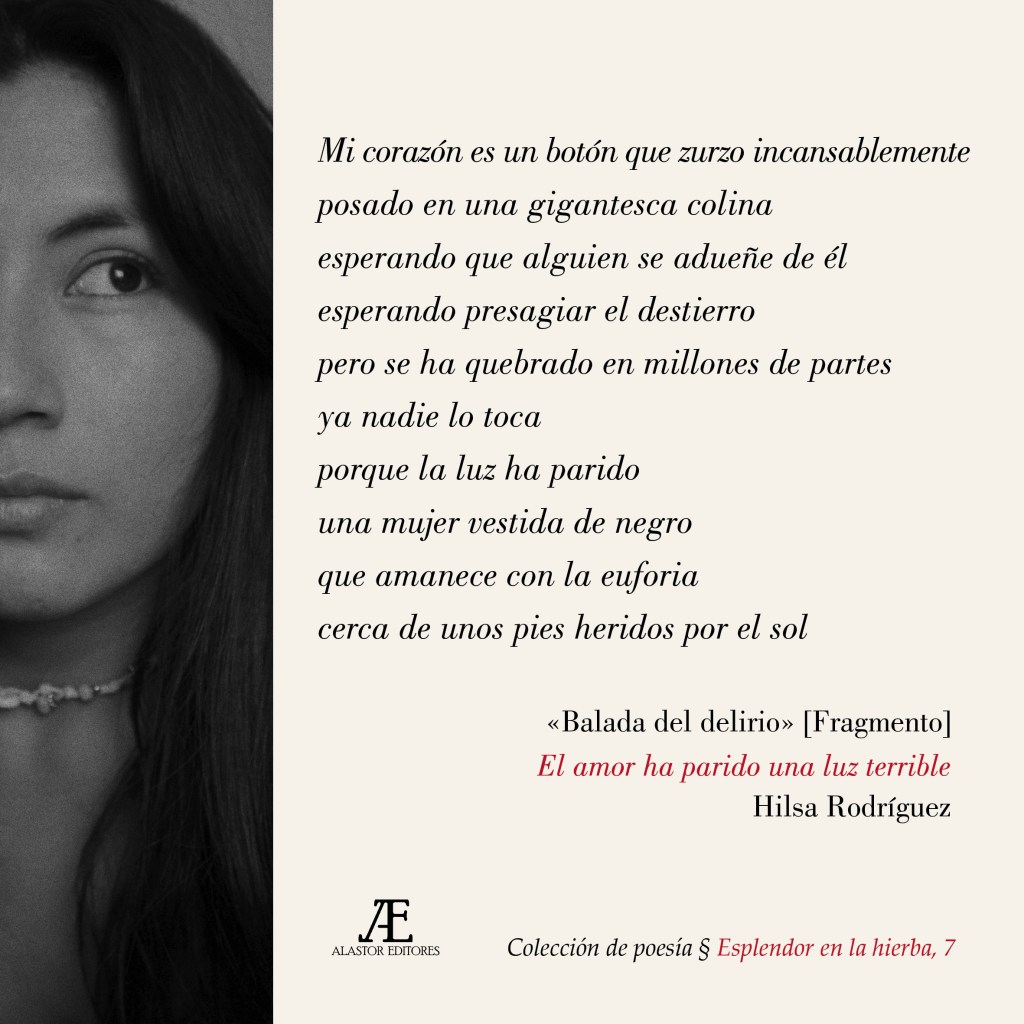 El amor ha parido una luz terrible (2023), primer libro de poemas de Hilsa Rodríguez (Trujillo, 1994), es el séptimo título de nuestra colección Esplendor en la hierba de primeros libros de poesía. Las cuatro secciones del libro nos muestran una progresión que va desde el reconocimiento de la monstruosidad de ciertas vivencias, producidas por la violencia y la precariedad de la existencia (con los consiguientes dolor, delirio, fobias y heridas que ello acarrea), hacia una búsqueda de la redención a través del amor creador, no necesariamente dirigido, como en el amor romántico, hacia un ser en particular, sino más bien hacia el vasto reino de lo viviente, que va desde el tangible reino animal hasta el inaprensible de los sueños. La poesía es parte esencial de este proceso de redención, que no siempre es posible sin conducirnos al mismo tiempo a la soledad y al silencio. El amor ha parido una luz terrible no es, en suma, un libro que ofrezca una solución fácil, sino muestra un genuino deseo por explorar y asumir todas las aristas de la existencia, por violentas y ominosas que sean, para mirar de frente y sin miedo, aquella luz terrible engendrada por el amor.
