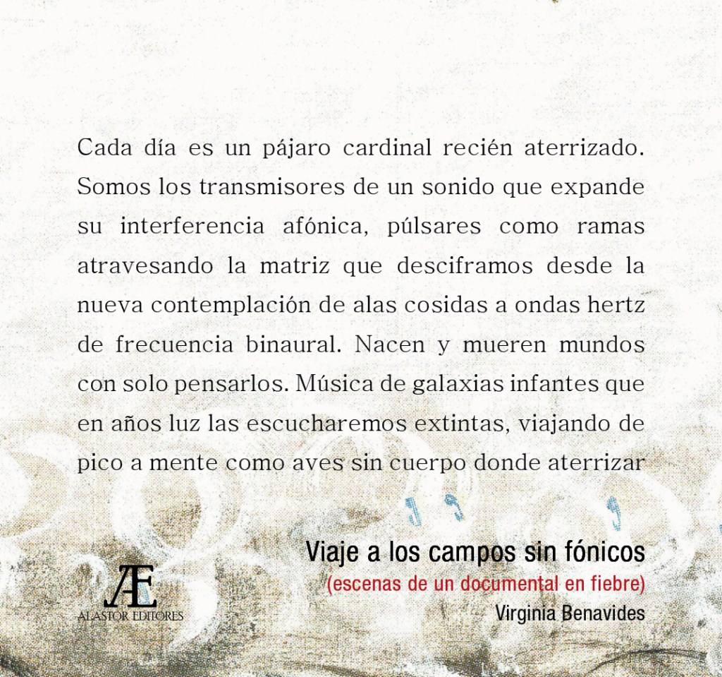 Este nuevo libro de poemas de Virginia Benavides constituye una audaz exploración, en estado febril, de los confines del lenguaje en la forma de un viaje “documentado” por diversas especies de campos, desde el mítico suelo nutricio donde se enraízan y tejen los elementos que forman lo más profundo de nuestro ser, hasta el infinito espacio exterior (e interior) al que podemos migrar y expandirnos en nuevas formas si nos dejamos arrebatar por la fiebre que amplifica nuestra sensorialidad. Sexta entrega de nuestra colección poética Musica ficta.