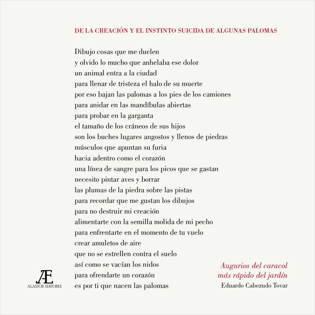 Augurios del caracol más rápido del jardín (2023) es el tercer poemario de Eduardo Cabezudo (Lima, 1981). Su lenguaje poético heterodoxo y desacralizador de lo poético rehuye del egocentrismo y personalismo en que naufragan otras propuestas iconoclastas gracias a que tras su poética desmitificadora alienta un sentimiento de solidaridad para el cual ningún hombre es una isla ni vive al margen del mundo histórico ni social. El dolor humano no tendrá, por lo tanto, un origen lejano ni abstracto sino condiciones concretas como la precariedad de la vida cotidiana, cuyos males son vistos a través de una mirada que, aunque por momentos puede ser amarga y satírica, siempre tiene espacio para la compasión y la ternura.