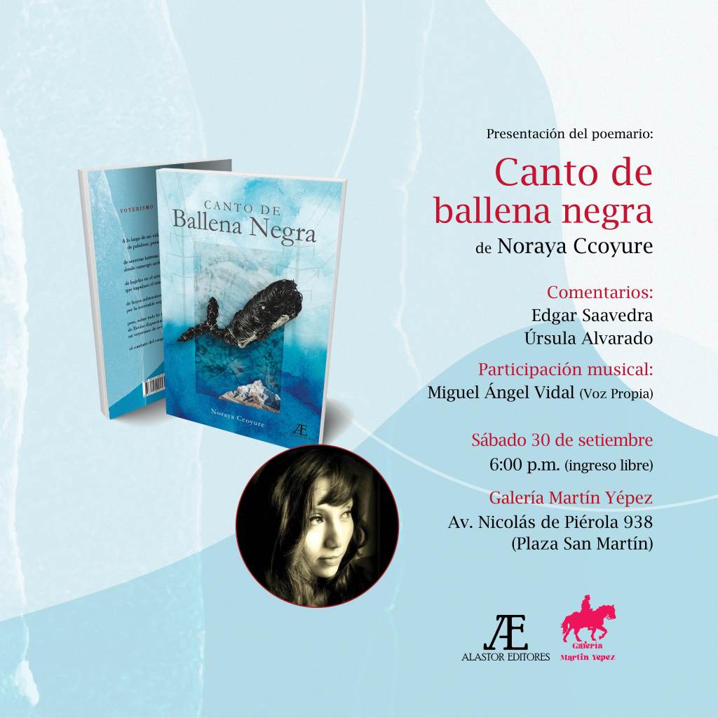 Las tres secciones de Canto de ballena negra (2023), primer libro de poemas de Noraya Ccoyure y octavo título de nuestra colección Esplendor en la hierba, muestran una progresión poética que va desde la inmediatez –no exenta de lírica crudeza– de los episodios y personajes (sicarios, barrenderas, etc.) de la primera sección, “Varamientos”; continúa en la segunda, “Cantos azules”, con el rescate de la memoria familiar de las garras del olvido y la locura; y adquiere en la tercera, “Playa desierta”, tras haber asimilado estos rescates y haberse despojado de lo accesorio, un espíritu más afirmativo y consciente de que es en el canto –la vocación poética– donde alcanza la plenitud de su ser. Los collages son de la artista Karla Ferré.