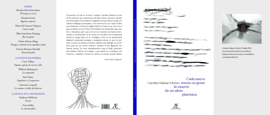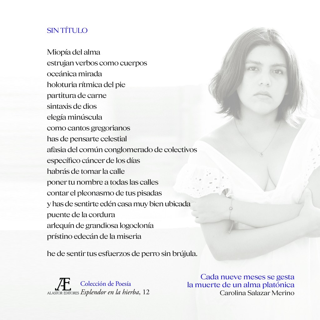 Cada nueve meses se gesta la muerte de un alma platónica es el primer libro de poemas de Carolina Salazar Merino (Trujillo, 1996) y el título número 12 de nuestra colección Esplendor en la hierba de primeros libros de poesía. Las cuatro secciones de Cada nueve meses… dan cuenta de una progresión que va desde lo familiar y social hasta incursionar en lo más hondo de los cuestionamientos existenciales, sin treguas ni concesiones, mediante una poesía de arco tensado en que las contradicciones no se resuelven de una manera cómoda. Antes bien, se nos invita a habitar el silencio, como una posible salida a la lucha de impulsos contrarios que compone nuestro ser.