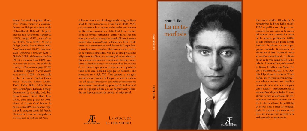 Esta nueva edición bilingüe de La metamorfosis de Franz Kafka (1883-1924) se publica no solo para conmemorar los cien años de la muerte del escritor, sino también los veinte de la primera publicación (2004) de esta traducción del poeta Renato Sandoval, la primera del autor praguense realizada directamente del alemán en el Perú. Además del prólogo del traductor “Franz Kafka, una vergüenza encumbrada”, esta edición incluye una detallada cronología de su vida, y se completa con el estudio “Interpretación de La metamorfosis” de Jean Ruffet. El texto alemán ha sido cuidadosamente revisado para esta nueva edición con el fin de ofrecer al lector la posibilidad de cotejar línea a línea las complejidades de traducir a un autor de una prosa tan transparente, pero plena de ambigüedades y significación.