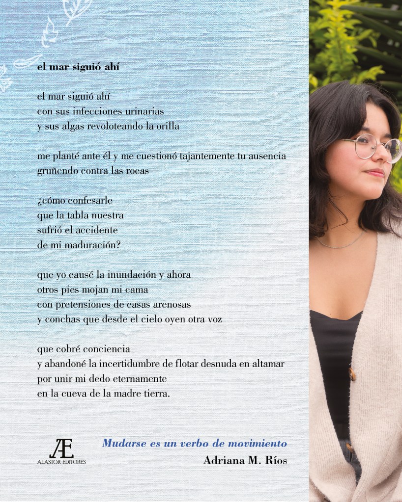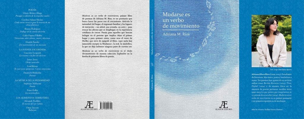 Mudarse es un verbo de movimiento es el primer libro de poemas de Adriana Maza Ríos (Lima, 2003) y el décimo tercer título de nuestra colección Esplendor en la hierba de primeros libros de poesía. Mudarse… es un poemario que busca hacer las paces con el crecimiento. Articula la intimidad del hogar, el engranaje familiar y los lugares de iniciación –un árbol, una avenida, un auto– para evocar los afectos que se despliegan en la experiencia cotidiana de crecer. Poesía para quienes buscan indagar en el proceso que implica dejar el primer hogar y para quienes creen, como reza el verso de Shelley, «que nada hay inmutable excepto la Mudanza», la real, la simbólica, la que no deja indemne ninguna parte de nuestro ser. El arte de la cubierta es de Yadhira García Chirinos y la foto de la autora de Jorge Chinchayan Aguirre.