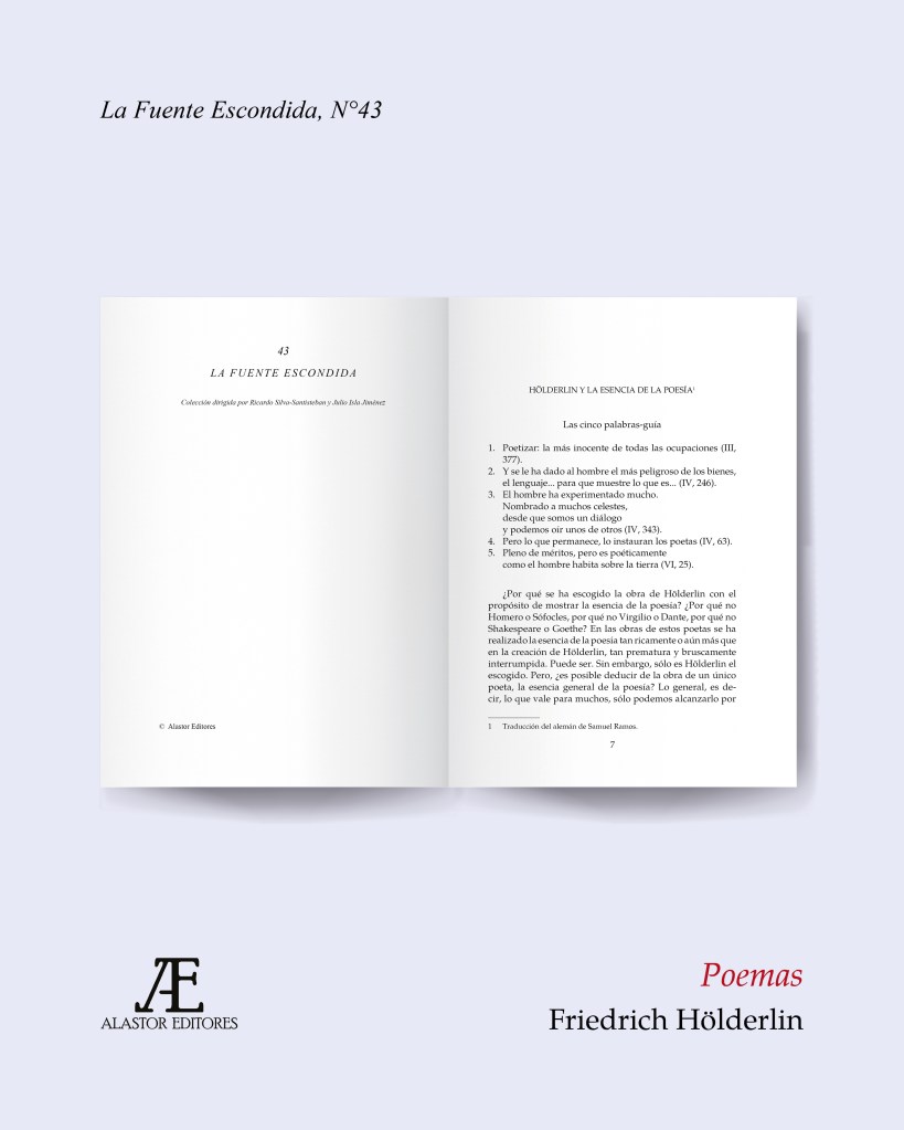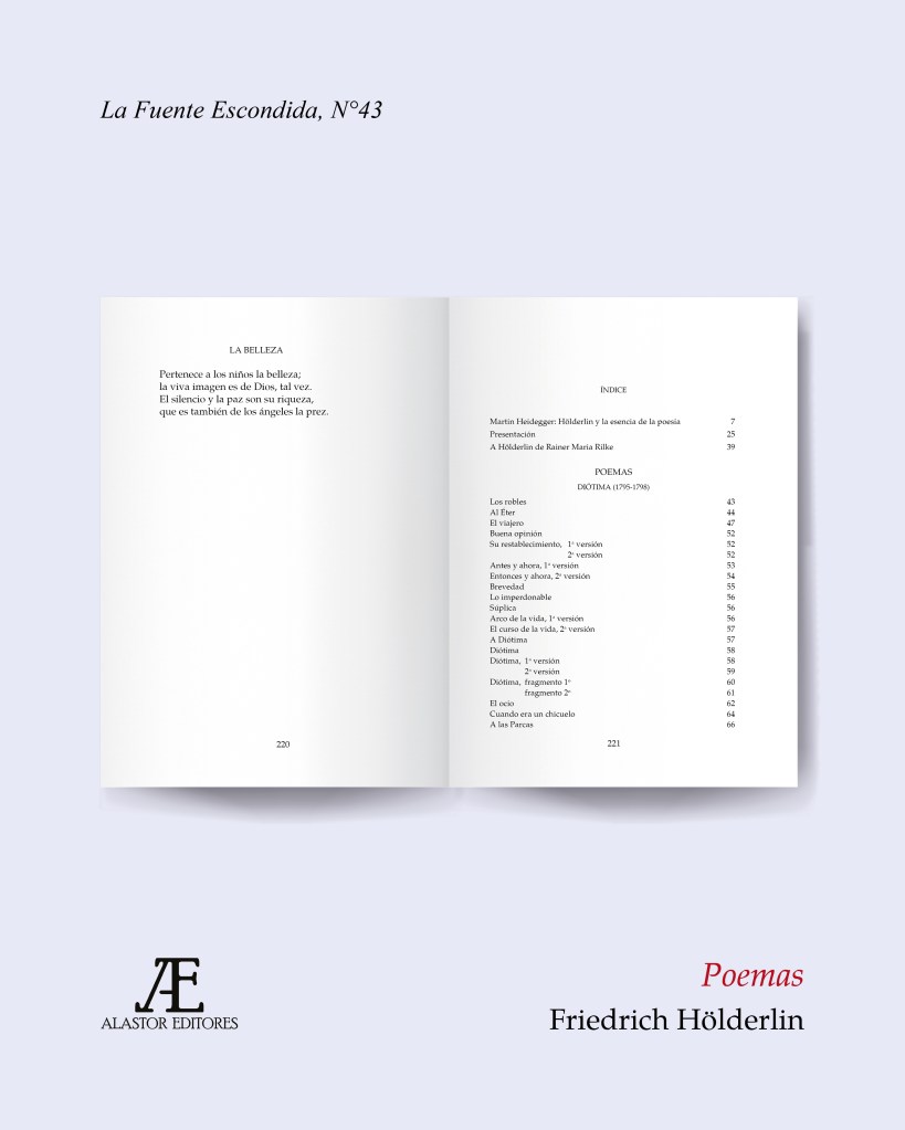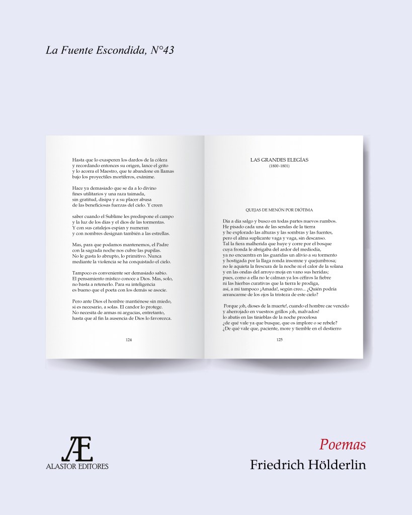 Poemas es una amplia y generosa selección de la obra poética de Hölderlin, uno de los máximos representantes del Romanticismo alemán. La traducción y la presentación son de José Vicente Álvarez. Se incluye un poema de Rilke dedicado al poeta. Completa el volumen “Hölderlin y la esencia de la poesía” de Martin Heidegger. En Poemas encontraremos poemas de juventud y madurez, odas, himnos, grandes elegías como “Pan y vino” o “El archipiélago” y los llamados poemas de la locura.