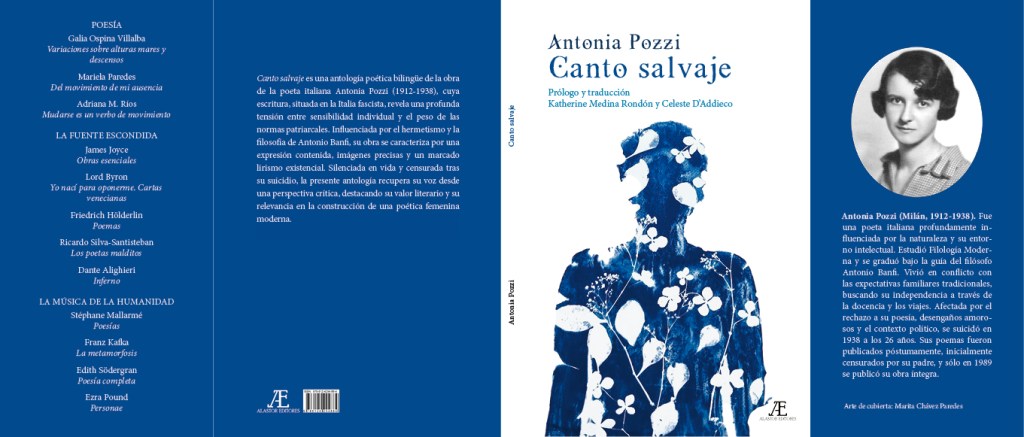 Canto salvaje es una antología poética bilingüe de la poeta italiana Antonia Pozzi (1912-1938), cuya escritura, situada en la Italia fascista, revela una profunda tensión entre sensibilidad individual y el peso de la normativa patriarcal. Silenciada en vida y censurada tras su suicidio, su obra es clave en la construcción de una poética femenina moderna. El prólogo, la selección y la traducción son de Katherine Medina Rondón y Celeste D’Addieco. La ilustración de la cubierta es de Marita Chávez.