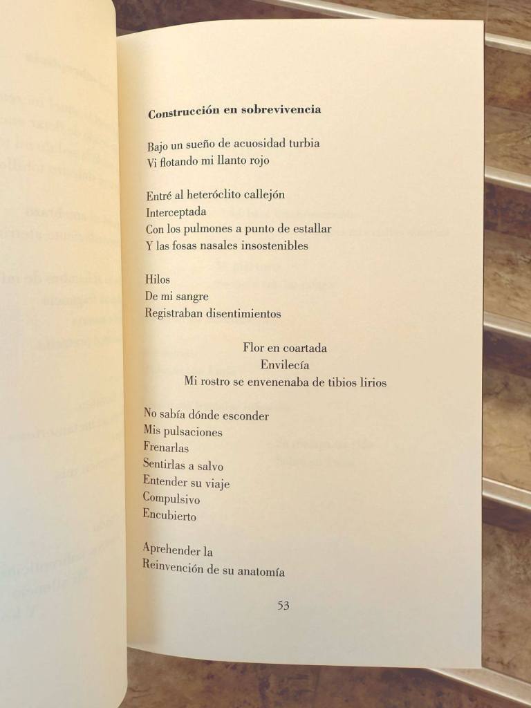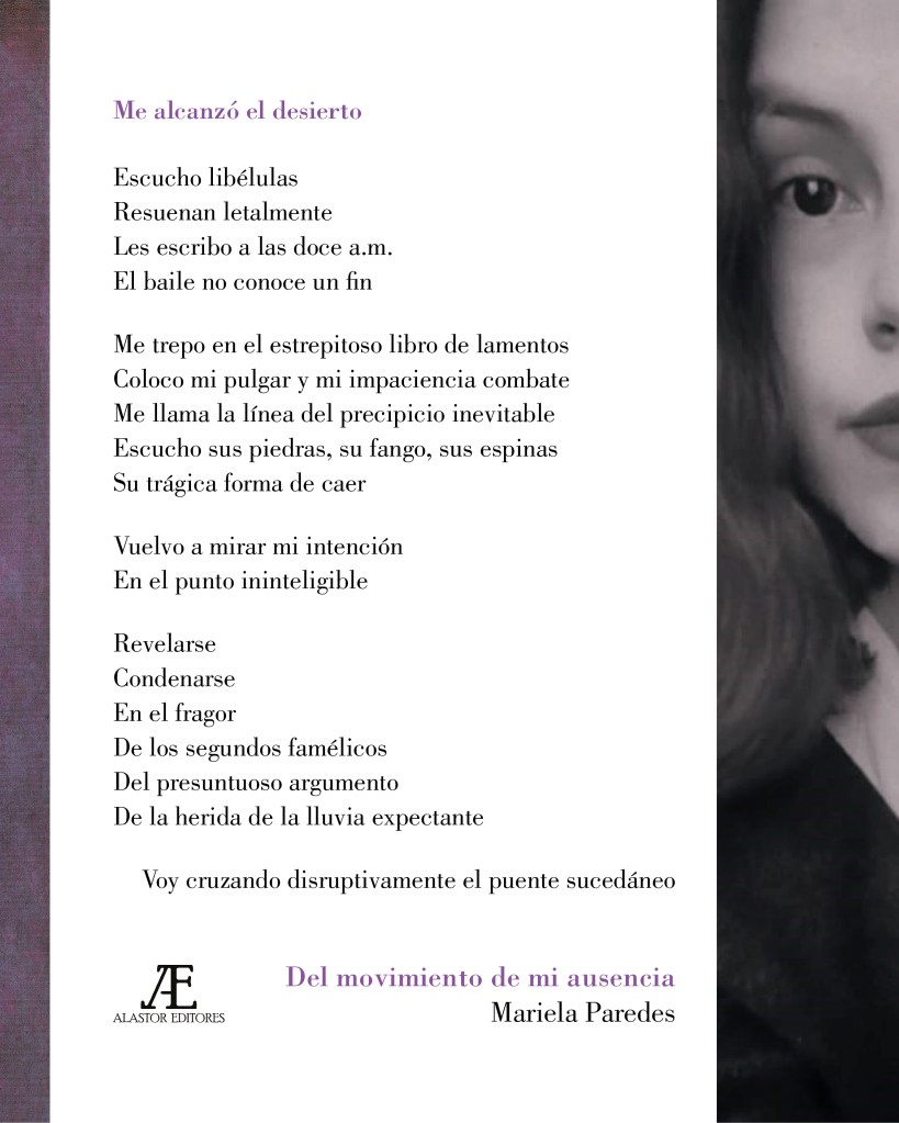 En este breve libro, la poeta Mariela Paredes propone una visión de la poesía como expresión del movimiento constante entre presencia y ausencia, el aparecer y ocultarse de los seres y las cosas en nuestra experiencia, movimiento que solo podemos atisbar parcialmente a través de intuiciones poéticas que nos permiten dar forma a una vivencia, y la autora lo hace mediante un verso conciso, huérfano de toda retórica, pero de alto contenido metafórico.