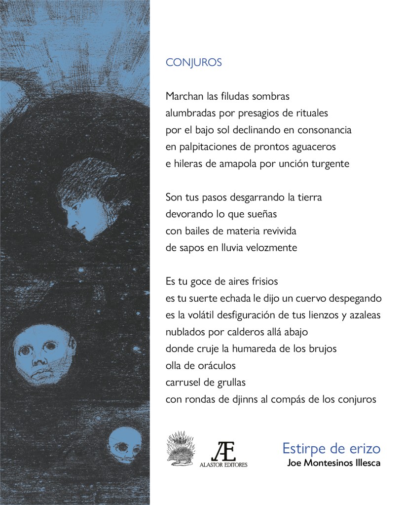 Estirpe de erizo, cuarto libro de poemas de Joe Montesinos Illesca, prolonga y profundiza las virtudes de sus primeros poemarios. Una imaginación poética desbordante se entrega a la creación de imágenes oníricas y significados inéditos que descolocan al lector y lo conducen a un universo con reglas propias donde no hay fronteras ni rangos entre lo animal y lo humano. El libro se acompaña de ilustraciones de Odilon Redon y tiene un prólogo de Rafael Ramírez.